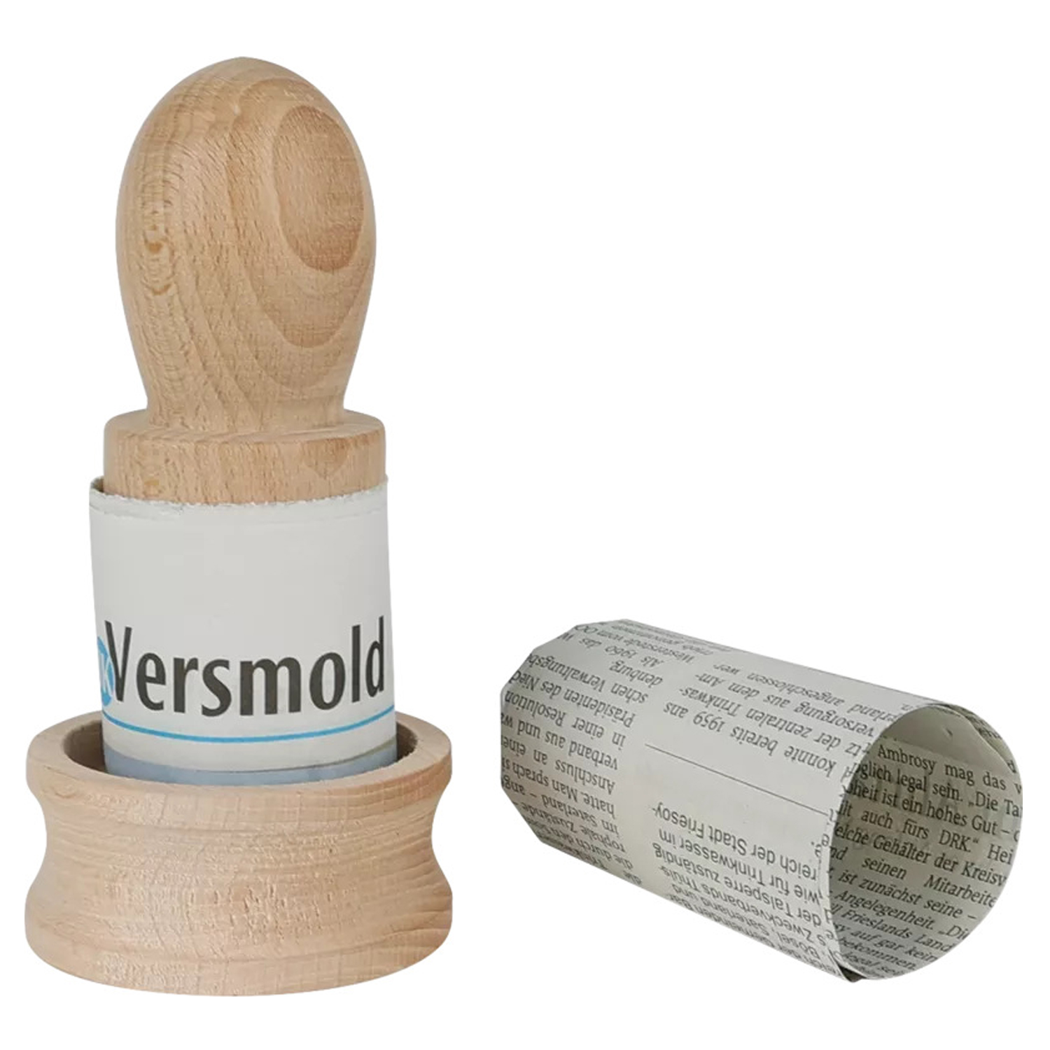 2. Den Stempel mit einem Streifen Zeitungspapier umwickeln. Dabei oben nur wenig überstehen lassen, während unten mehr Rand bleibt, um später den Boden zu formen.